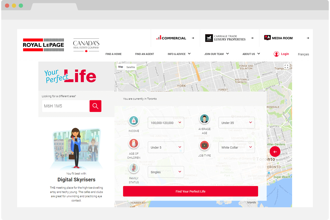 Following a quick background check, users could submit their own data points such as family and occupational details, as well as aspirational qualities that further guided the results. Based on this data, the application served up an exploration of ideal neighbourhoods along with contact info for a local Royal LePage agent who could help them take the next step.